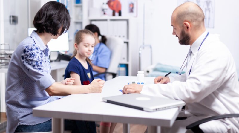 Mother writing child treatment on clipboard sitting in medical office. Pediatrician specialist in medicine with mask providing health care services, consultation, treatment in hospital during covid-19